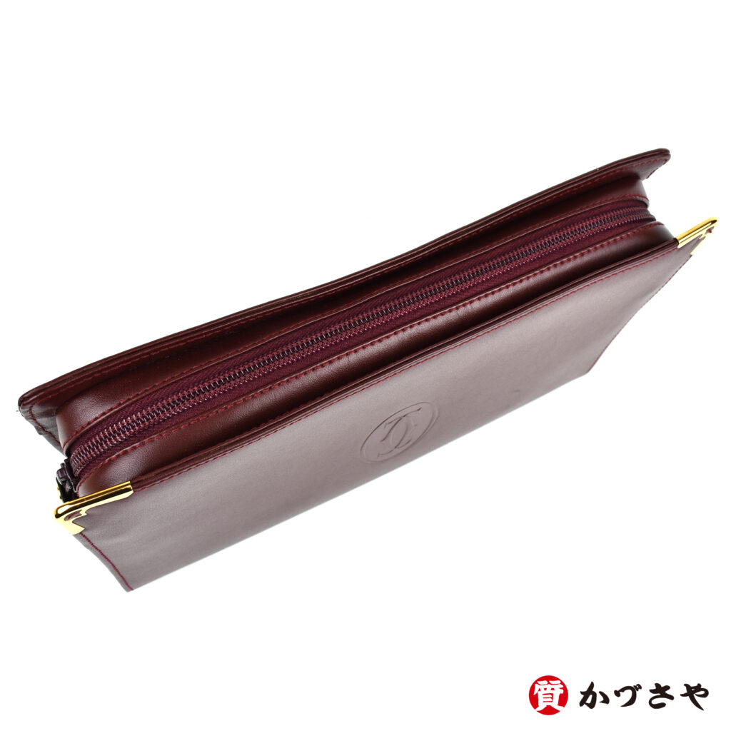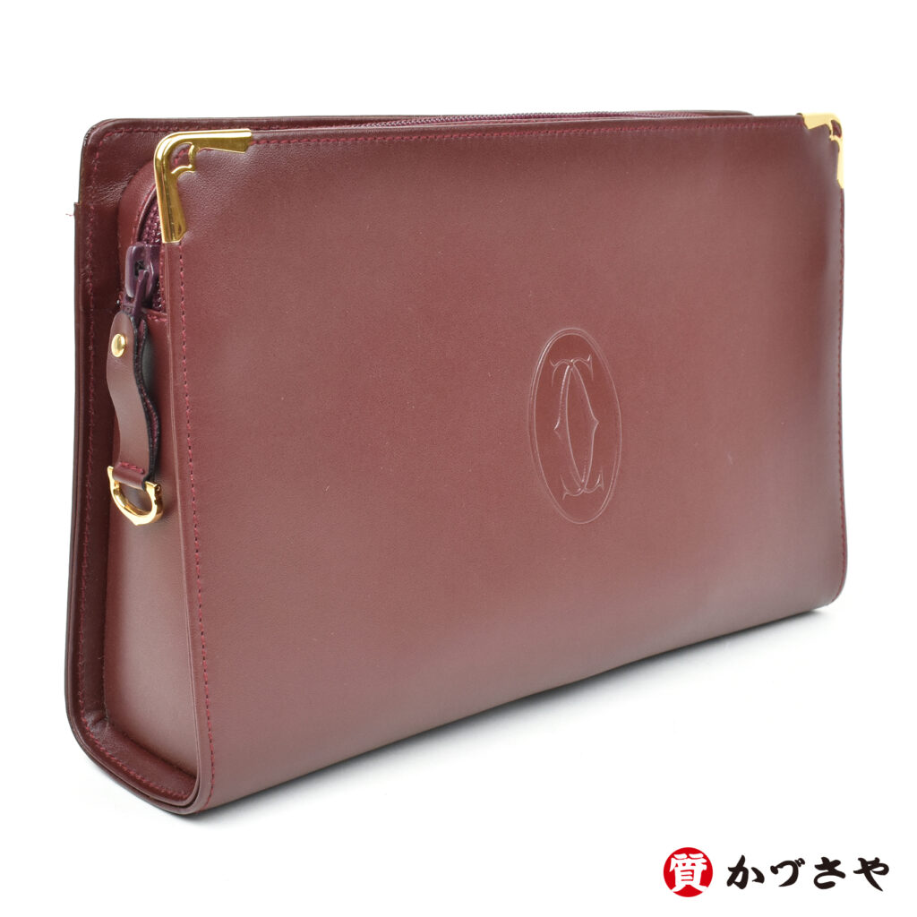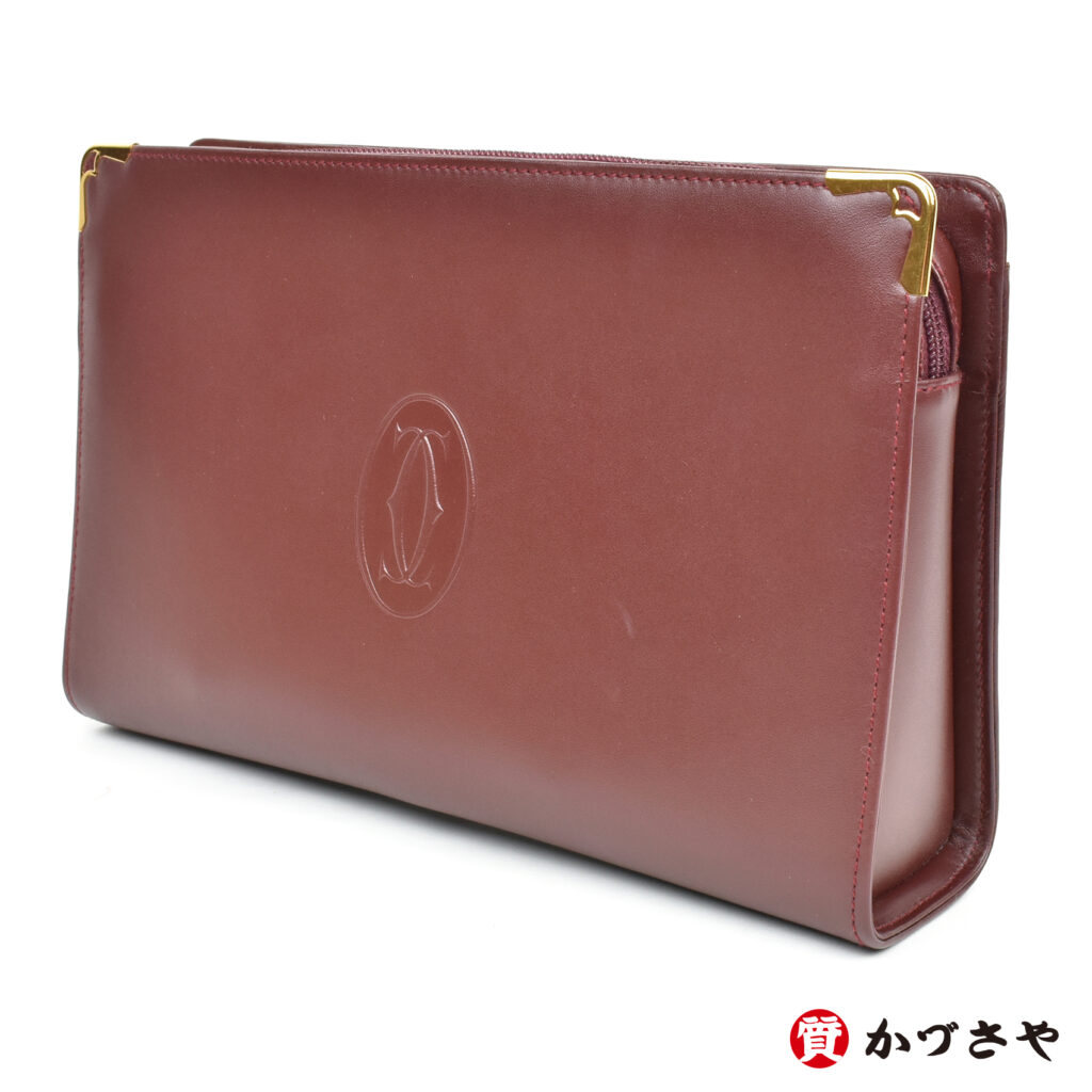 カルティエを象徴する落ち着いたボルドーカラーにゴールドの金具が生える、レトロなキュートさとエレガントな落ち着きが両立したクラッチバッグです。