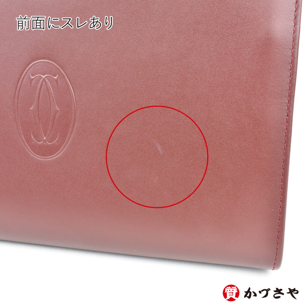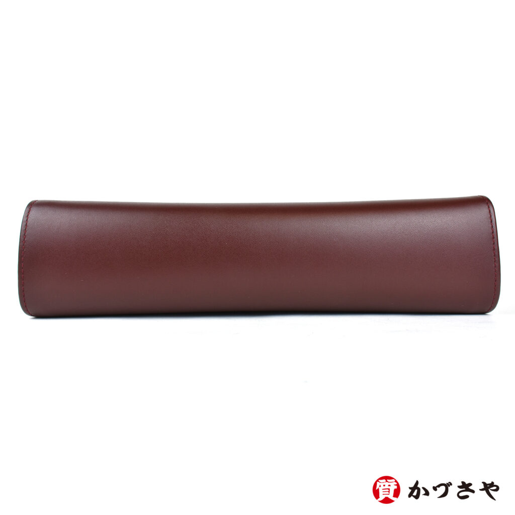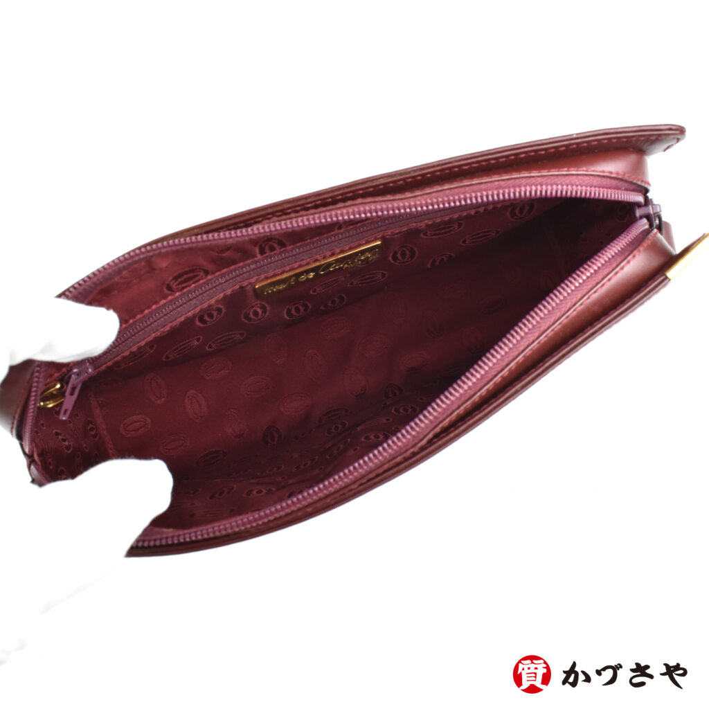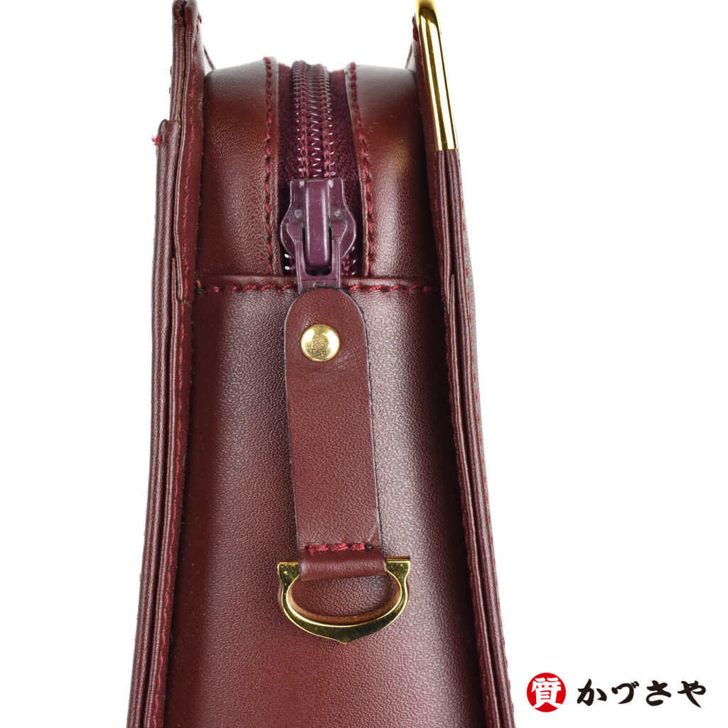 カルティエを象徴する落ち着いたボルドーカラーにゴールドの金具が生える、レトロなキュートさとエレガントな落ち着きが両立したクラッチバッグです。