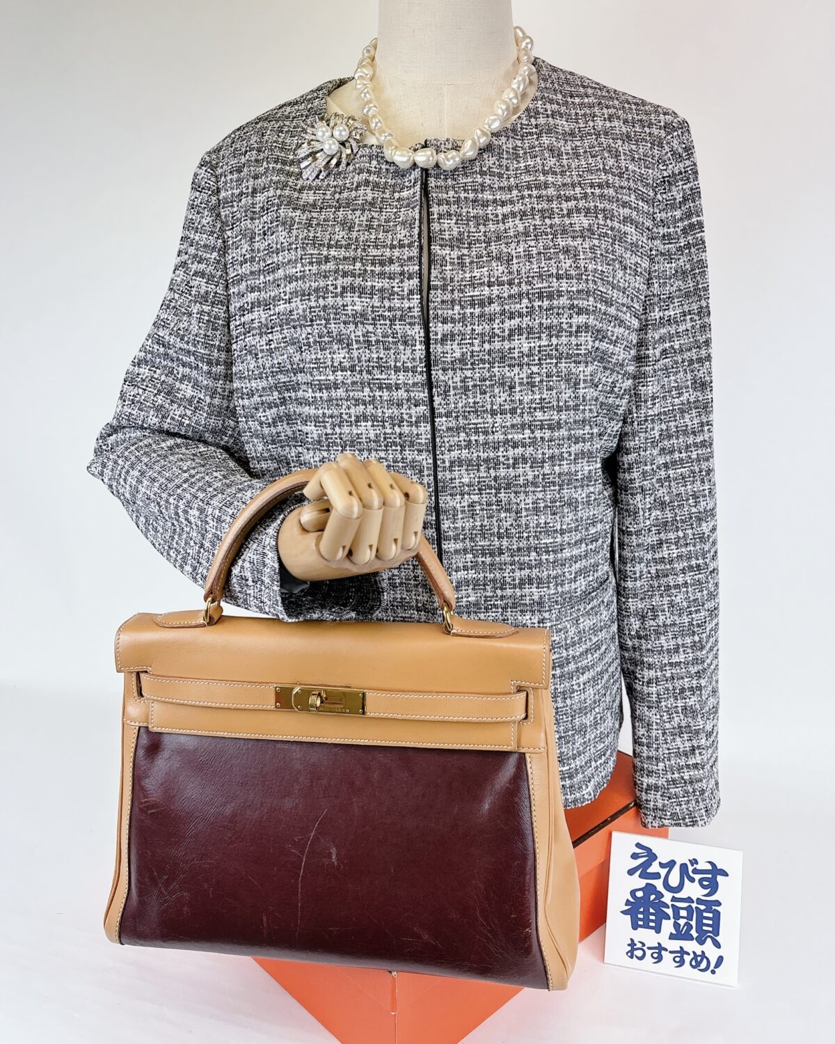 モナコ公国グレース・ケリー公妃にちなんだエルメスのフォーマルバッグの代表格。かっちりした美しいフォルムでありながら、バイカラーがカジュアルな印象です。正面に目立つ傷、角すれ、内側にペン汚れがございます。【 ©️刻印 1973年製 】
